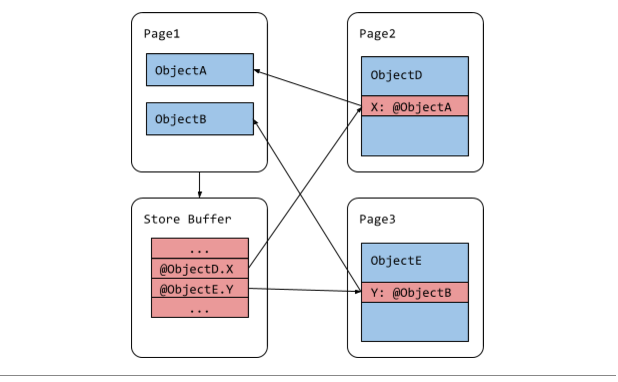 Previously, V8 implemented remembered sets as arrays of pointer addresses, or store buffers. There was one store buffer for the young generation and one for each of the fragmented old generation pages. The store buffer of a page contains addresses of all incoming pointers as shown in Figure 3. Entries are appended to a store buffer in a write barrier, which guards write operations in JavaScript code. This may result in duplicate entries since a store buffer may include a pointer multiple times and two different store buffers may include the same pointer. Duplicate entries make parallelization of the pointer update phase difficult because of the data race caused by two threads trying to update the same pointer.
