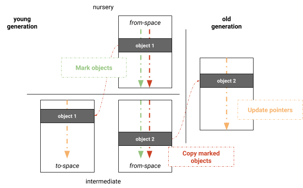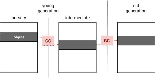 V8 partitions its managed heap into generations where objects are initially allocated in the “nursery” of the young generation. Upon surviving a garbage collection, objects are copied into the intermediate generation, which is still part of the young generation. After surviving another garbage collection, these objects are moved into the old generation (see Figure 1). V8 implements two garbage collectors: one that frequently collects the young generation, and one that collects the full heap including both the young and old generation. Old-to-young generation references are roots for the young generation garbage collection. These references are recorded to provide efficient root identification and reference updates when objects are moved.