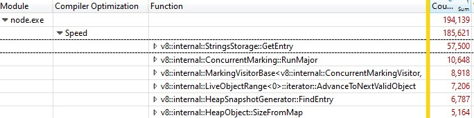 They took recordings using Windows Performance Analyzer (see below) in order to narrow down the issue. This revealed that most CPU time was being spent within the V8 Heap Explorer. Specifically, it took around 30 minutes just to walk through the heap to visit each node and collect the name. This didn’t seem to make much sense — why would recording the name of each property take so long?